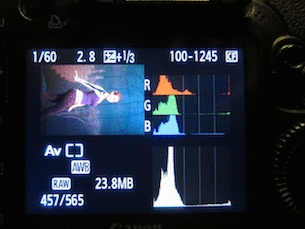 When there is a pause in the action, take time to look at the playback display, particularly the histogram. This process of looking at the display has acquired the pejorative name of chimping (after photographers who exclaim "ooh! ooh! ahh! ahh!" at their own shots) but it is an important part of accelerating the learning, correction, and improvement process.